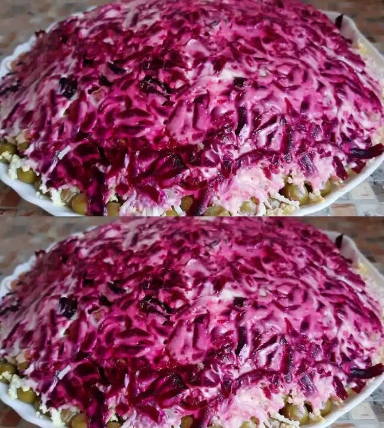 Останній шар — буряк. Беру варений буряк, натираю на терці й розподіляємо зверху. Змащую майонезом, щоб завершити салат. Залишаю його настоятися в холодильнику пару годин — тоді смак розкриється повністю, і можна подавати на стіл.