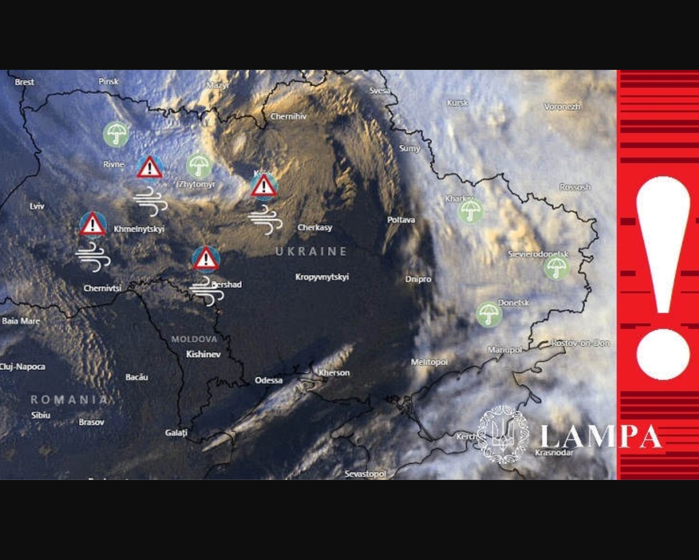 В найближчі години циклон буде зміщуватись далі на схід, вітер посилиться до екстремальних відміток(23-30 м/с) на Київщині, Чернігівщині, Сумщині, Полтавщині, а в решті областей півночі, центру та на сході очікуються пориви 18-24 м/с.