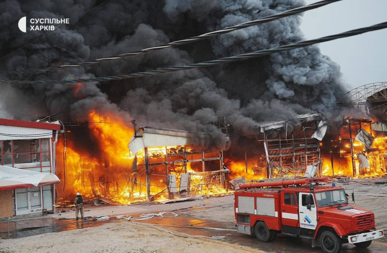 Наразі на ринку «Барабашово» рятувальники гасять пожежу після російського удару.