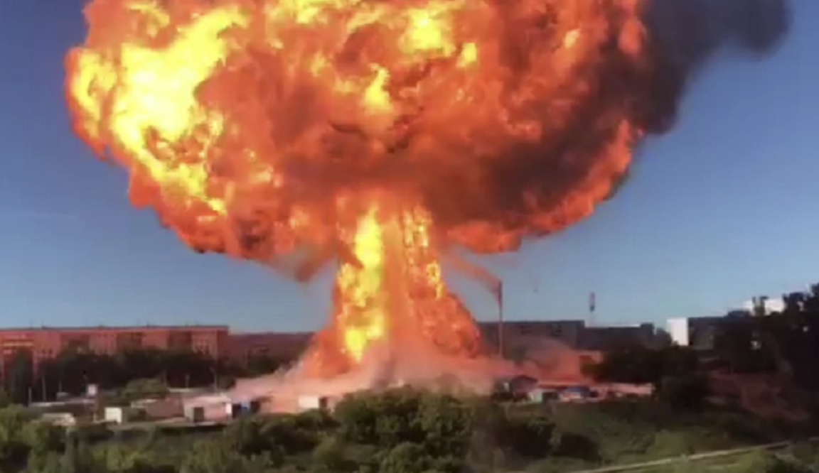 Як повідомляють місцеві ЗМІ, на відео результат вибуху цистерни з толуолом, який є матеріалом для виготовлення, зокрема, і вибухових речовин.