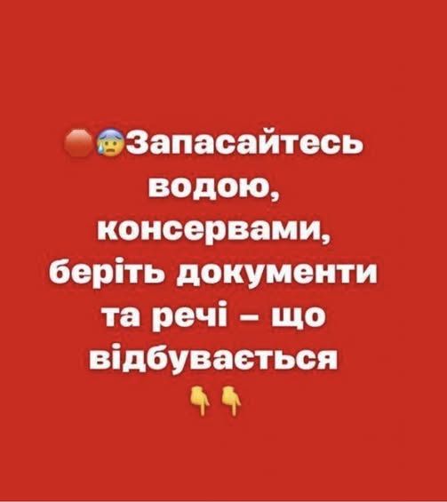 Передусім слід зробити запаси питної та технічної води на кожного члена сім’ї — приблизно 3 літри питної та 11–12 літрів технічної на добу. Також варто подбати про продукти тривалого зберігання, медикаменти та аптечку.
