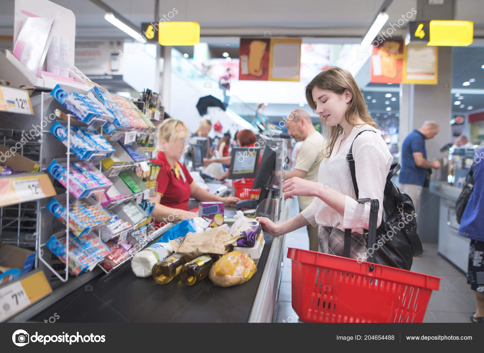 Girl stands at the supermarket and waits for a queue.Pays for purchases at the supermarket's cash desk.Smiling girl with red basket in hand standing at the checkout in the supermarket and buy products