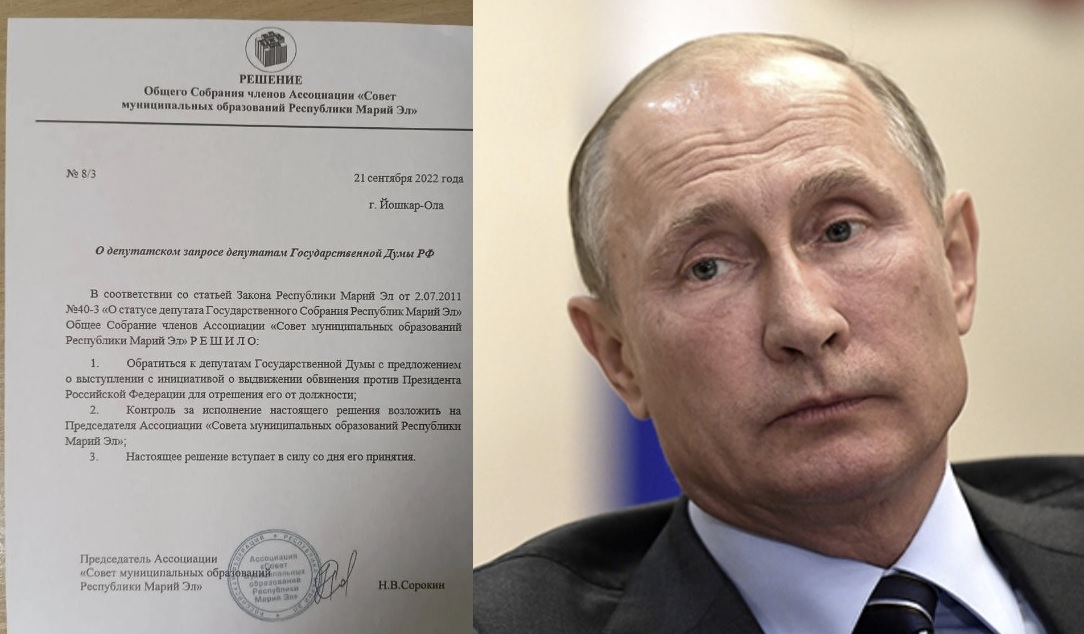 Російські муніципальні депутати з Марій Ел офіційно звернулися до Державної Думи РФ, щоб вона усунула володимира путіна з посади. Це сталося того ж дня, коли в росії оголосили часткову мобілізацію.