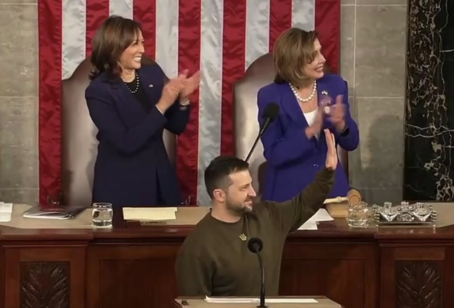 Володимир Зеленський також передав Конгресу прапор від наших військових із Бахмута, і у відповідь отримав прапор США з рук Ненсі Пелосі.