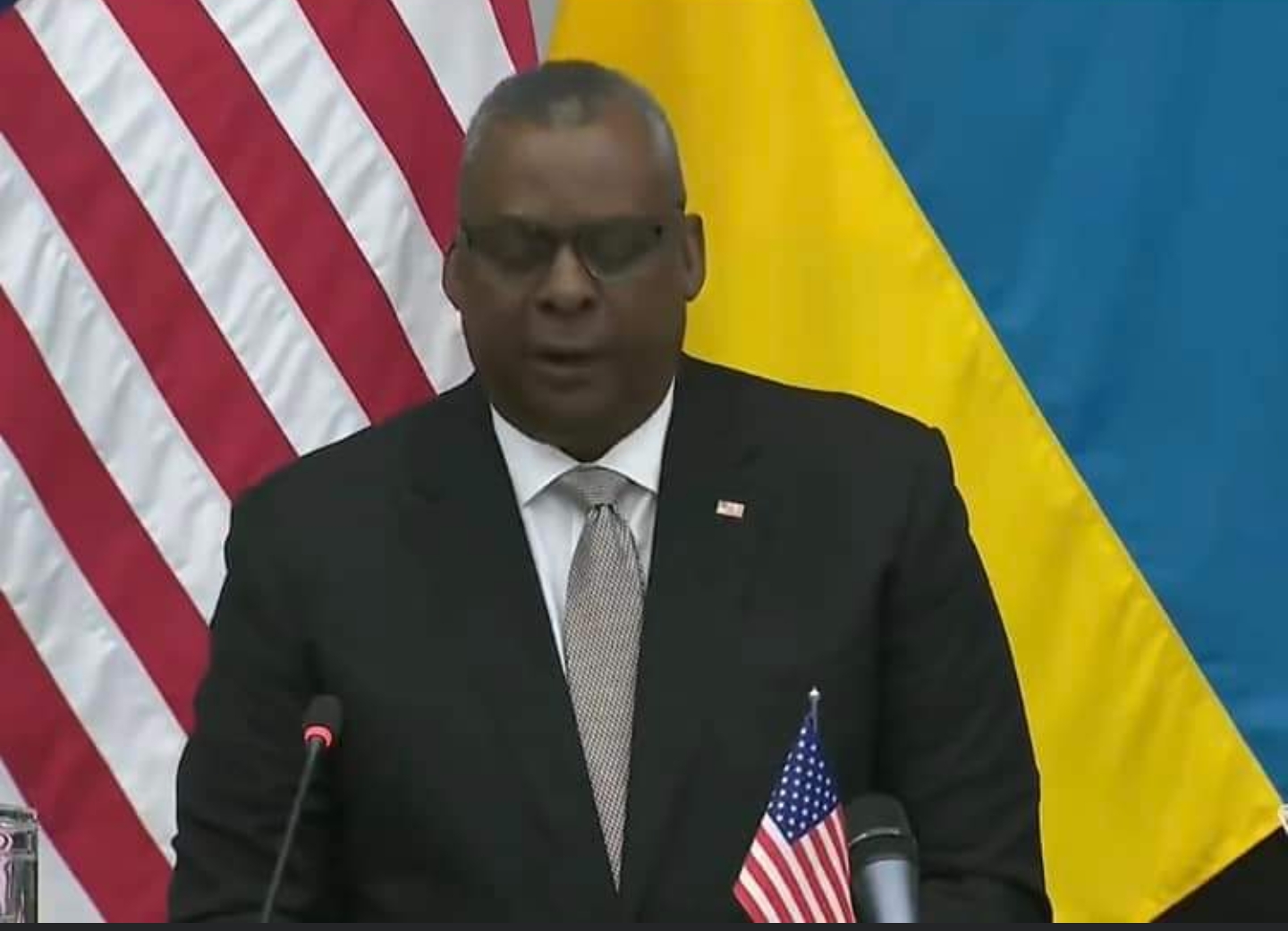 -Міністр оборони США Ллойд Остін під час виступу на «Рамштайні-6» в Брюсселі.