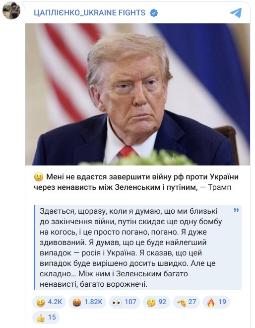“Насправді, я дуже здивований. Я сказав, що цей випадок буде вирішено досить швидко. Але це складно, між Путіним та Зеленським багато ненависті, як ви знаєте, багато ворожнечі й багато було пролито крові”, – сказав Трамп.