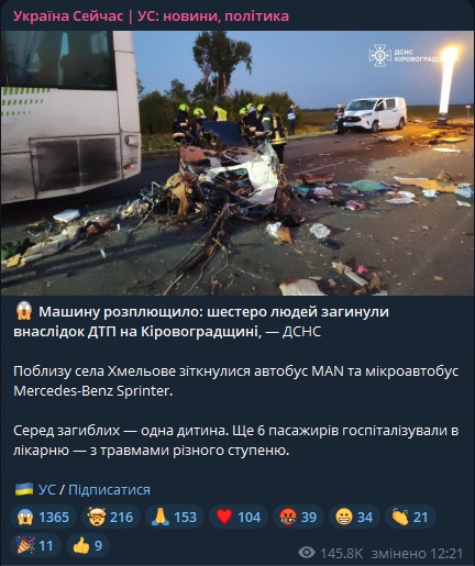 Зазначається, що шістьох травмованих госпіталізували до лікарні. Автотроща за участі автобуса MAN і мікроавтобуса Mercedes-Benz Sprinter сталася біля села Хмельове Новоукраїнського району.