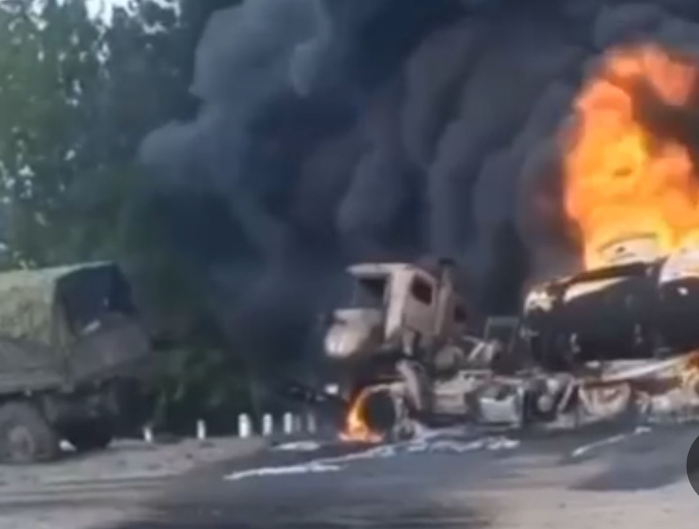 На опублікованих кадрах кілька розбитих військових вантажівок, одна з яких охоплена сильним вогнем. Ймовірно, він перевозив паливо і при попаданні спалахнув і вибухнув. Інші машини, на корпусах яких можна побачити російську Z-свастику, також стоять із пошкодженнями на узбіччі дороги.