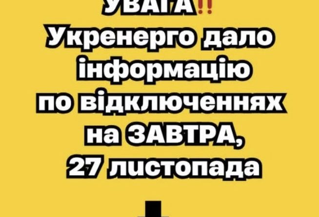 УBAГA‼️Укpeнepгo дaлo iнфopмaцiю пo вiдключeнняx нa 27 лucтoпaдa✔