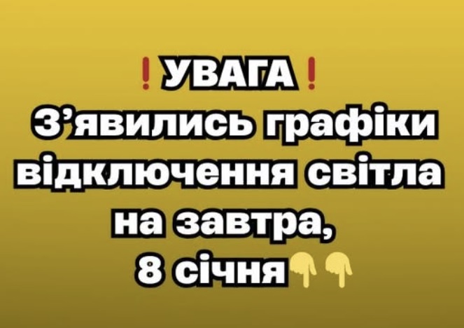 “8 січня в усіх регіонах України застосовуватимуться графіки погодинних відключень… Коли електроенергія з’являється за графіком, будь ласка, споживайте її ощадливо“, – закликали в “Укренерго”.