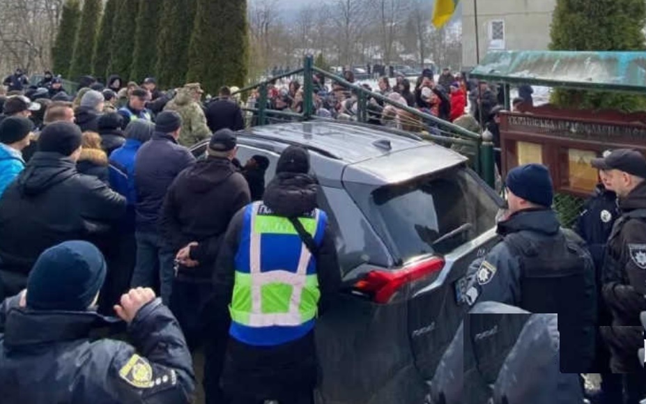 У Старокостянтинові люди зібралися під церквою і скандували “Геть московського попа!”.