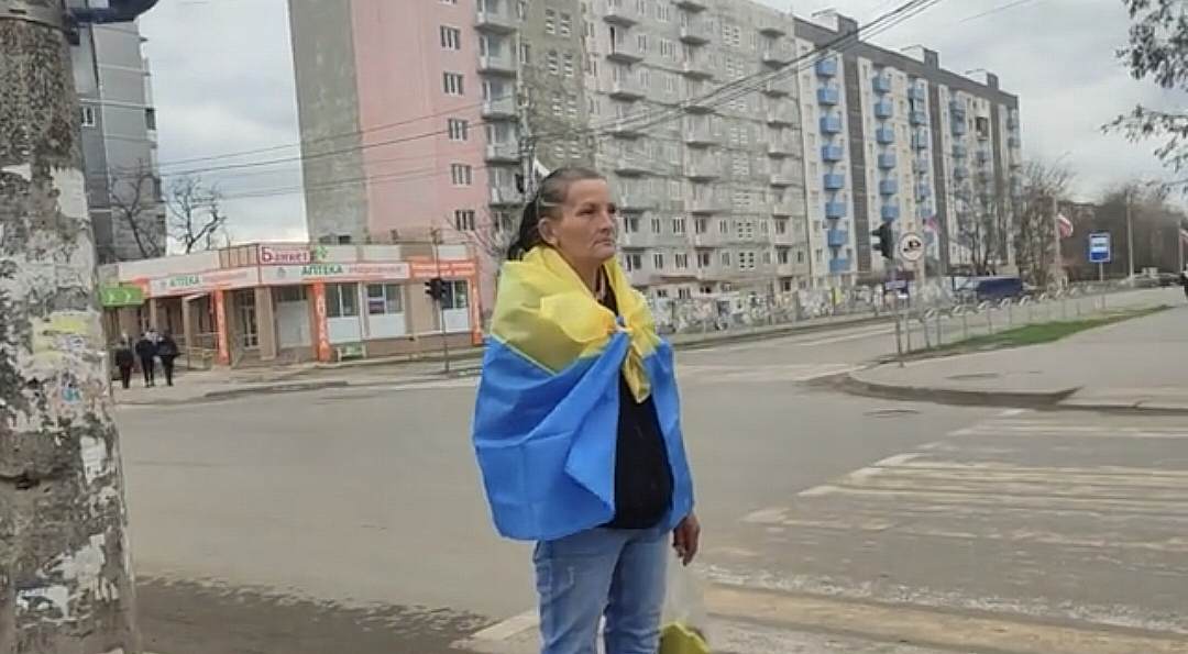 У тимчасово окупованому Маріуполі жінка вийшла на вулицю, загорнувшись в український прапор.