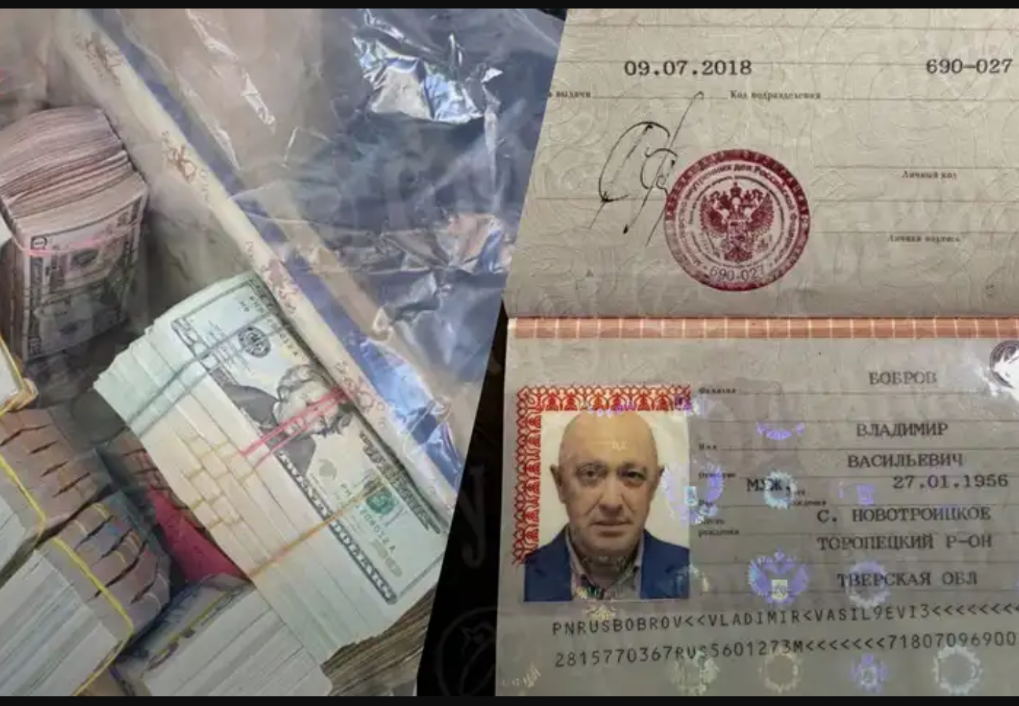 Фото знайдених речей публікують російські ЗМІ, повідомляє 24 Канал. Зокрема в очільника ПВК “Вагнера” знайшли кілька паспортів – один на його ім’я, а інші – підроблені.